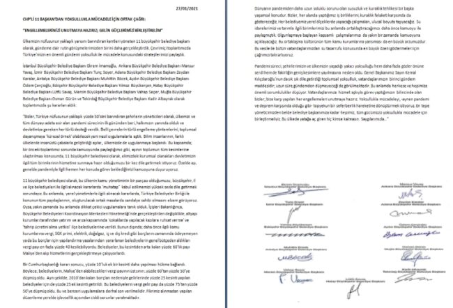 CHP’li 11 Büyükşehir Belediye Başkanı, çevrimiçi toplantıda bir araya geldi. Türkiye nüfusunun yaklaşık yüzde 50’sini barındıran kentleri yöneten başkanlar, yaptıkları ortak açıklamada, ülkedeki en önemli gündem maddesinin “yoksulluk” olduğuna vurguladılar. Özellikle pandemi sürecinden olumsuz etkilenen vatandaşlara ulaştırmak için yaptıkları çalışmaların merkezi hükümet tarafından engellenmeye çalışıldığını hatırlatan başkanlar, yaptıkları ortak açıklamada, “Genel Başkanımız Sayın Kemal Kılıçdaroğlu’nun da sık sık dile getirdiği toplumsal yoksulluk, vatandaşlarımızın birinci gündem maddesidir; uzun süre gündemden düşmeyeceği de görülmektedir. Bu anlamda herkese ve hepimize önemli sorumluluklar düşüyor. Vatandaşlarımıza hizmet aşkıyla görev yaptığımızın bilincinde olan bizler; bize karşı yapılan her engellemeleri unutmaya hazırız. Yoksullukla mücadeleyi, topyekun bir seferberlik hareketine dönüştürmek istiyoruz. En tepe yöneticimizden belde belediye başkanımıza kadar hepimiz, tüm gücümüzü yoksullukla mücadele için birleştirmeliyiz. Bu ülkede yatağa aç giren hiç kimse kalmasın” ifadelerini kullandı.