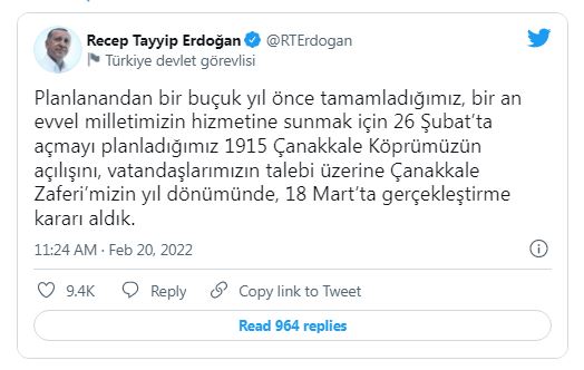 Sosyal medya hesabından açıklama yapan Cumhurbaşkanı Erdoğan, “Planlanandan bir buçuk yıl önce tamamladığımız, bir an evvel milletimizin hizmetine sunmak için 26 Şubat’ta açmayı planladığımız 1915 Çanakkale Köprümüzün açılışını, vatandaşlarımızın talebi üzerine Çanakkale Zaferi’mizin yıl dönümünde, 18 Mart’ta gerçekleştirme kararı aldık” ifadelerini kullandı.