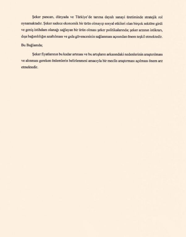 Araştırma önergesinin gerekçesinde, Türk Şeker’in 15 Kasım 2021 tarihinde şeker fiyatına yaptığı yüzde 25 zamdan sonra Eylül 2022’ye kadar yeni zam yapılmayacağını açıklamasına rağmen, mart ve haziran aylarında şekere yapılan zamlar ve kontenjan düzenlemesi hatırlatıldı.
