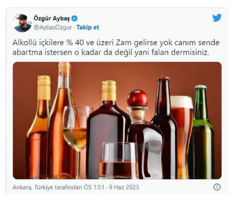 Tekel Bayileri Platform Başkanı Özgür Aybaş, Twitter hesabından “Alkollü içkilere yüzde 40 ve üzeri zam gelirse yok canım sende abartma istersen o kadar da değil yani falan der misiniz” paylaşımında bulundu.