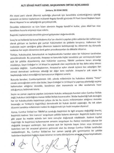 Cumhurbaşkanı adayını belirleme konusunda altı siyasi partinin istişare, uzlaşı ve halkın tercihlerini yansıtacak şekilde çalıştığını buradan duyurmak isteriz. Halkımız, ülkemizin hak ettiği refaha ulaşma ve yeniden demokratikleşme ümidini altı partinin birliğinde görmektedir. Bu da bize tarihi bir görev yüklemektedir. Biliyoruz ki bu Türkiye’nin kader seçimidir. Halkımız canını, malını, geleceğini, medeni, hür ve refah içinde bir Türkiye’de nefes alma ümidini bize emanet etmiştir. Halkımız müsterih olsun, altı parti bu görevi layıkıyla tamamlayacaktır.
