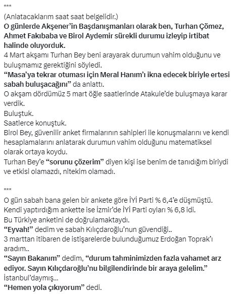 O günlerde Akşener’in başdanışmanları olarak ben, Turhan Çömez, Ahmet Fakıbaba ve Birol Aydemir sürekli durumu izleyip irtibat halinde oluyorduk.
