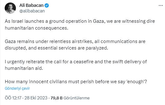 DEVA Partisi Genel Başkanı Ali Babacan, İsrail’in Gazze’ye başlattığı operasyon sonrası gece 00.19’da sosyal medya hesaplarından Türkçe ve İngilizce açıklamalarda bulundu.