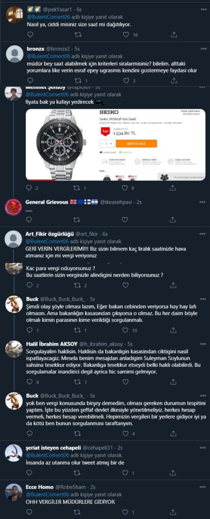 En ucuzu 1500 lira olan SEIKO marka saati paylaşan Cömert, “Bakanımız Sayın Süleyman SOYLU’ya Bu Güzel Hediyeleri İçin Teşekkür Ederiz.” ifadelerini kullandı.
