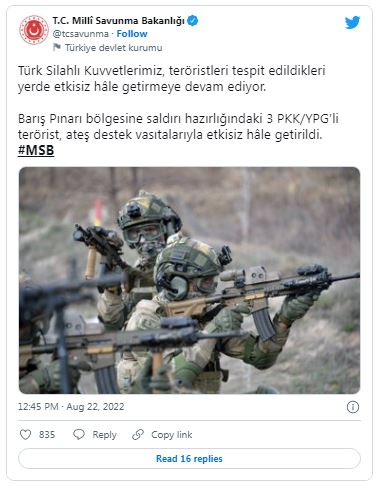 Bakanlıktan yapılan açıklamada, Türk Silahlı Kuvvetlerinin teröristleri tespit edildikleri yerde etkisiz hale getirmeye devam ettiği vurgulanarak, “Barış Pınarı bölgesine saldırı hazırlığındaki 3 PKK/YPG’li terörist, ateş destek vasıtalarıyla etkisiz hale getirildi.” bilgisine yer verildi.