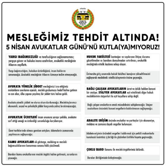 Türkiye Barolar Birliği (TBB) ile 81 ilin Baroları ortak açıklama ile “Mesleğimiz Tehdit Altında! 5 Nisan Avukatlar Günü’nü Kutla(ya)mıyoruz!” diyerek mesleğe tehditleri tek tek sıraladı.