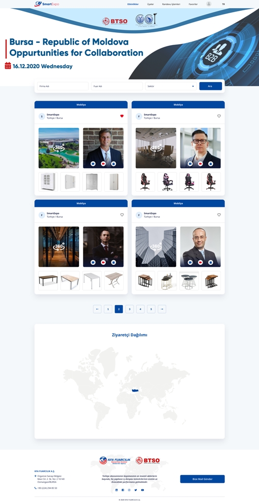 Tüm dünyayı etkisi altına alan yeni tip koronavirüs salgını döneminde üyelerine yönelik birçok özgün çalışmayı hayata geçiren BTSO, işletmelerin ihracatçı kimliğini güçlü tutmak için yeni bir hamle daha gerçekleştirdi. Küresel Fuar Acentesi Projesi kapsamında hazırlanan www.smartexpo.com.tr online platformu, Bursalı firmaların yurt dışındaki firmalarla çevrimiçi ikili iş görüşmesine fırsat tanıyor. BTSO tarafından geliştirilen yazılım, ilk defa Bursalı ve Moldovalı firmaların katıldığı online buluşmada kullanıldı.