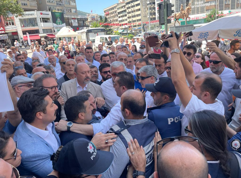 Polis, benzin bidonlarının AK Parti binasına bırakılmak istenmesine izin verilmeyince büyük arbede yaşandı. Yaşanan arbedede İYİ Parti Milletvekilleri Selçuk Türkoğlu ve Hasan Toktaş polis tarafından tartaklanırken, Parti yöneticilerinden Şaban Aksoy başından yaralandı.