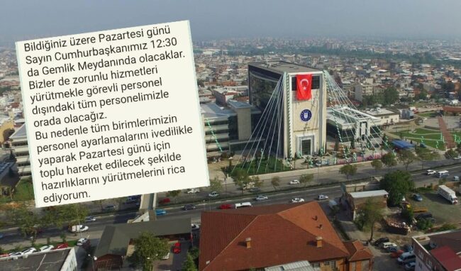 Belediye Başkanı Alinur Aktaş tarafından personele gönderilen mesajda, “Bildiğiniz üzere pazartesi günü Sayın Cumhurbaşkanımız 12.30’da Gemlik Meydanı’nda olacaklar. Bizler de zorunlu hizmetleri yürütmekle görevli personel dışındaki tüm personelimizle orada olacağız. Bu nedenle tüm birimlerimizin personel ayarlamalarını ivedilikle yaparak pazartesi günü toplu hareket edilecek şekilde hazırlıklarını yürütmelerini rica ediyorum” denildi.