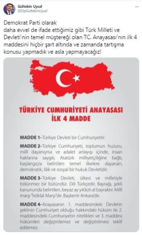 “Demokrat Parti olarak daha evvel de ifade ettiğimiz gibi Türk Milleti ve Devleti’nin temel müştereği olan TC. Anayasası’nın ilk 4 maddesini hiçbir şart altında ve zamanda tartışma konusu yapmadık ve asla yapmayacağız!”