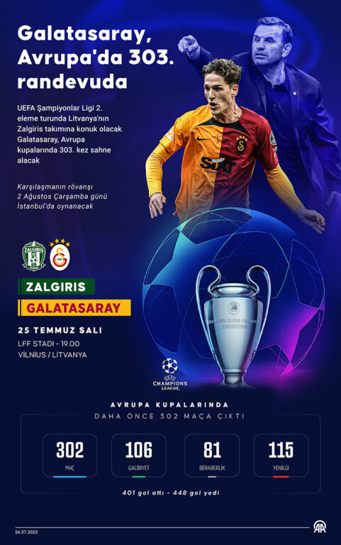 UEFA Şampiyonlar Ligi 2. eleme turunda Litvanya’nın Zalgiris takımına konuk olacak Galatasaray, Avrupa kupalarında 303. kez sahne alacak.