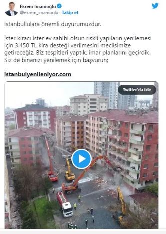 İmamoğlu, “İster kiracı ister ev sahibi olsun riskli yapıların yenilemesi için 3450 TL kira desteği verilmesini meclisimize getireceğiz. Biz tespitleri yaptık, imar planlarını geçirdik. Siz de binanızı yenilemek için başvurun” dedi.