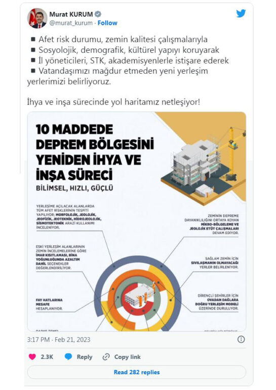 Çevre, Şehircilik ve İklim Değişikliği Bakanı Murat Kurum, sosyal medya hesabından, Kahramanmaraş merkezli depremlerin ardından bölgedeki inşa ve ihya sürecine ilişkin paylaşımda bulundu.