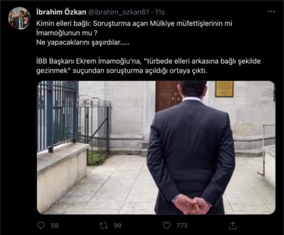 İstanbul Cumhuriyet Başsavcılığı, “Fatih Sultan Mehmet’in eşi Gülbahar Hatun’un türbesinde elleri arkasına bağlı bir şekilde gezinmek suretiyle saygısızlık yaptığı” ve “HDP’li belediyeleri ziyaret ederek görevini kötüye kullandığı, suçluyu övdüğü” iddialarıyla ilgili olarak İBB Başkanı Ekrem İmamoğlu hakkında soruşturma açmak için İçişleri Bakanlığı’na başvurdu.