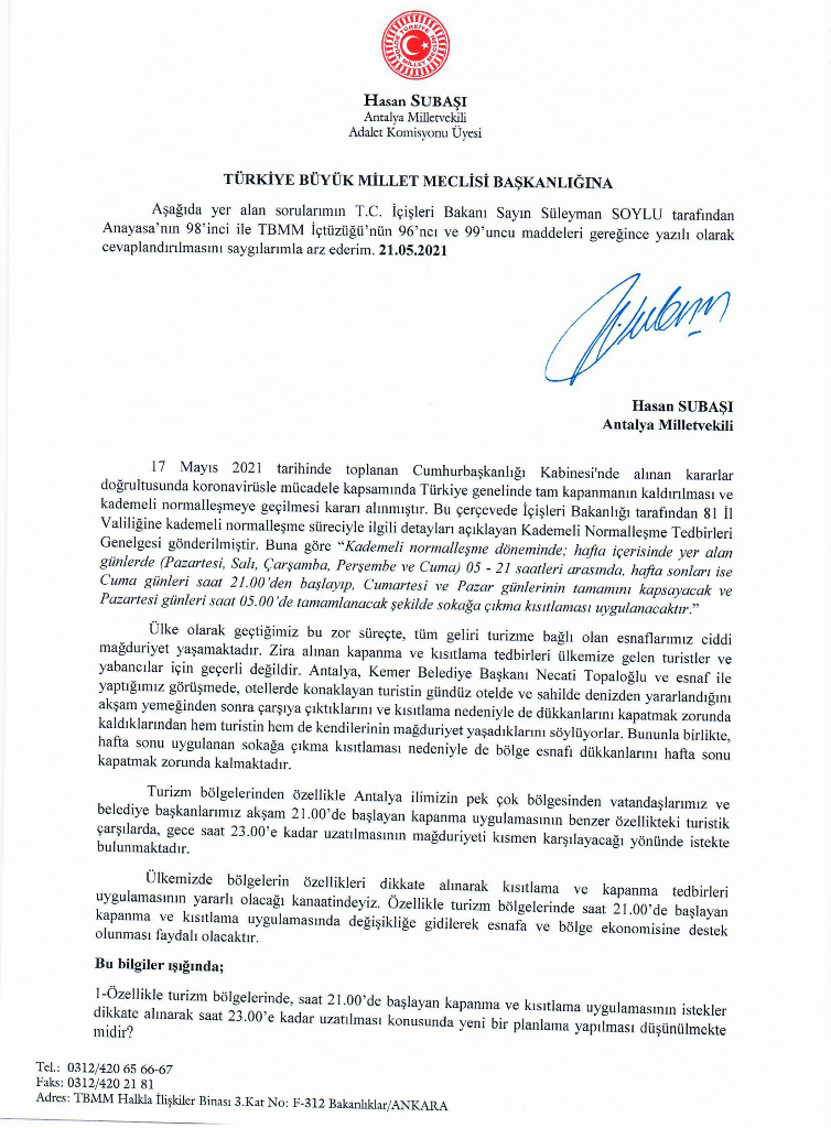 Antalya Milletvekili Hasan Subaşı, önergesinde Bakan’a şu soruyu yöneltti; “Özellikle turizm bölgelerinde saat 21.00’de başlayan kapanma ve kısıtlama uygulamasının istekler dikkate alınarak saat 23’e kadar uzatılması konusunda yeni bir planlama yapılması düşünülmekte midir?”
