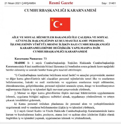 Aile ve Sosyal Hizmetler Bakanlığı ile Çalışma ve Sosyal Güvenlik Bakanlığının Kurulması ile Kamu Personel İşlemlerinin Yürütülmesine İlişkin Bazı Cumhurbaşkanlığı Kararnamelerinde Değişiklik Yapılmasına Dair 73 numaralı Cumhurbaşkanlığı Kararnamesi Resmi Gazete’de yayımlandı.