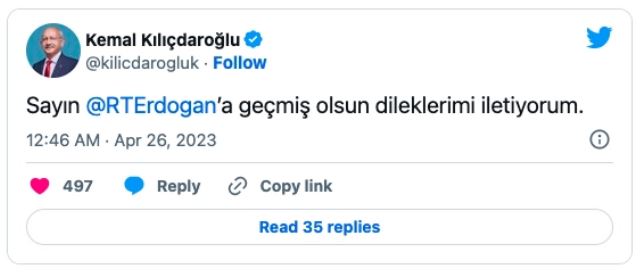 Kılıçdaroğlu, Twitter hesabından yaptığı paylaşımda, “Sayın @RTErdogan’a geçmiş olsun dileklerimi iletiyorum” dedi.