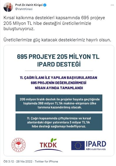 Kirişci, sosyal medya hesabından yaptığı paylaşımda, “Kırsal kalkınma destekleri kapsamında 695 projeye 205 milyon lira hibe desteğini üreticilerimizle buluşturuyoruz. Üreticilerimize güç katacak desteklerimiz hayırlı olsun.” ifadelerini kullandı.