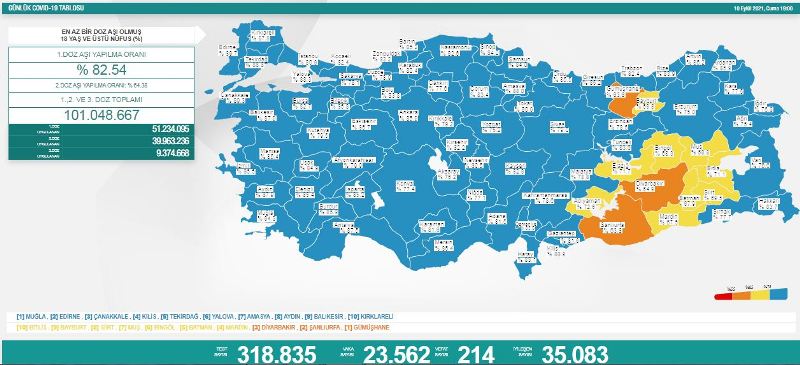 Sağlık Bakanı Fahrettin Koca’nın açıkladığı 10 Eylül 2021 Cuma gününün corona virüsü verilerine göre, Türkiye’de son 24 saatte 318 bin 835 Kovid-19 testi yapıldı, 23 bin 562 kişinin testi pozitif çıktı, 214 kişi hayatını kaybetti.
