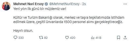 Kültür ve Turizm Bakanı Mehmet Nuri Ersoy, sosyal medya hesabından, “Yeni yılın ilk günü bir müjdemiz var.” ifadesiyle yaptığı açıklamada, Kültür ve Turizm Bakanlığı olarak, merkez ve taşra teşkilatında istihdam edilmek üzere, çeşitli ünvanlarda 1500 personel alımı gerçekleştireceklerini kaydetti.