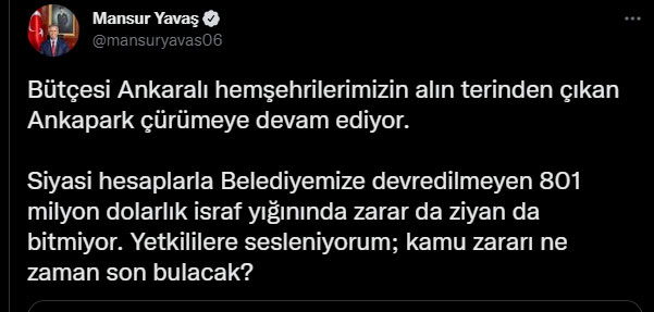 801 milyon dolar kamu kaynağı gömülen Ankapark’ın Ankara Büyükşehir Belediyesi’ne devredilmemesi Başkan Mansur Yavaş’ı isyan ettirdi: Yetkililere sesleniyorum; kamu zararı ne zaman son bulacak?