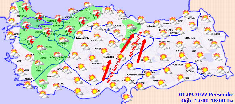 RÜZGAR: Kuzey kesimlerde kuzeyli, diğer yerlerde güneyli yönlerden hafif ara sıra orta kuvvette, Doğu Akdeniz’in Toroslar kesimi, İç Anadolu’nun doğusu ile Doğu Anadolu’nun batı kesimlerinde kuvvetli (30-60 km/saat) esmesi bekleniyor.