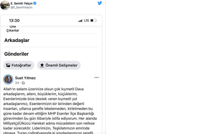 Teşkilatlardan Sorumlu MHP Genel Başkan Yardımcısı Semih Yalçın, Suat Yılmaz’ın istifasını belirttiği sosyal medya paylaşımını Twitter hesabından yorum yapmadan paylaştı! Semih Yalçın, daha önce hiçbir istifa açıklamasını sosyal medya hesabından paylaşmamıştı.