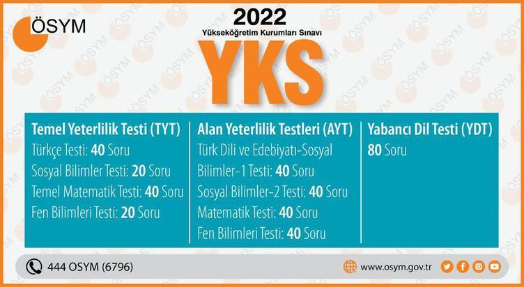 2022-YKS soru dağılımları konusunda Aygün, “18 Haziran Cumartesi günü saat 10.15’te uygulanacak olan Temel Yeterlilik Testi’nde (TYT) adaylara, Türkçe Testi’nde 40, Sosyal Bilimler Testi’nde 20, Temel Matematik Testi’nde 40, Fen Bilimleri Testi’nde 20 soru olmak üzere toplam 120 soru sorulacak ve 165 dakika süre verilecek. 19 Haziran Pazar günü saat 10.15’te yapılacak olan Alan Yeterlilik Testlerinde (AYT), Türk Dili ve Edebiyatı-Sosyal Bilimler-1 Testi’nde 40 soru, Sosyal Bilimler-2 Testi’nde 40 soru, Matematik Testi’nde 40 soru, Fen Bilimleri Testi’nde 40 soru sorulacak ve 180 dakika süre verilecek. 19 Haziran Pazar günü saat 15.45’te gerçekleşecek Yabancı Dil Testi (YDT) 5 dilde uygulanacak, 80 soru sorulacak ve 120 dakika süre verilecek.” dedi.