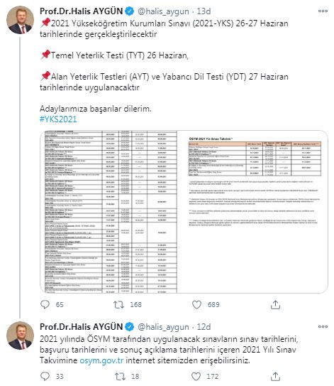 ÖSYM Başkanı Aygün, 2021 yılı sınav takviminin “https://www.osym.gov.tr/” adresinden açıklandığını, YKS’nin TYT oturumunun 26 Haziran’da, AYT ve YDT oturumlarının ise 27 Haziran’da yapılacağını bildirdi.