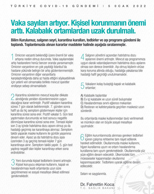 Yeni durumda kişisel tedbirlerin öneminin arttığını, kişisel koruyucu ekipman kullanımı, kapalı ve havalandırması kısıtlı ortamlarda uzun süre geçirilmemesi ve sosyal mesafeye dikkat edilmesi gerektiğini vurgulayan Koca, salgının yönetimi açısından hatırlatma dozu aşılarının da öneminin arttığına dikkati çekti.
