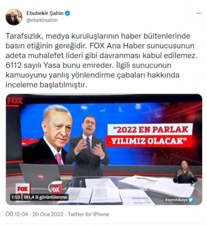 Ebubekir Şahin, gece yarısı sosyal medya hesabından yaptığı paylaşımda, “Tarafsızlık, medya kuruluşlarının haber bültenlerinde basın etiğinin gereğidir. FOX Ana Haber sunucusunun adeta muhalefet lideri gibi davranması kabul edilemez. 6112 sayılı Yasa bunu emreder. İlgili sunucunun kamuoyunu yanlış yönlendirme çabaları hakkında inceleme başlatılmıştır” ifadelerini kullandı.