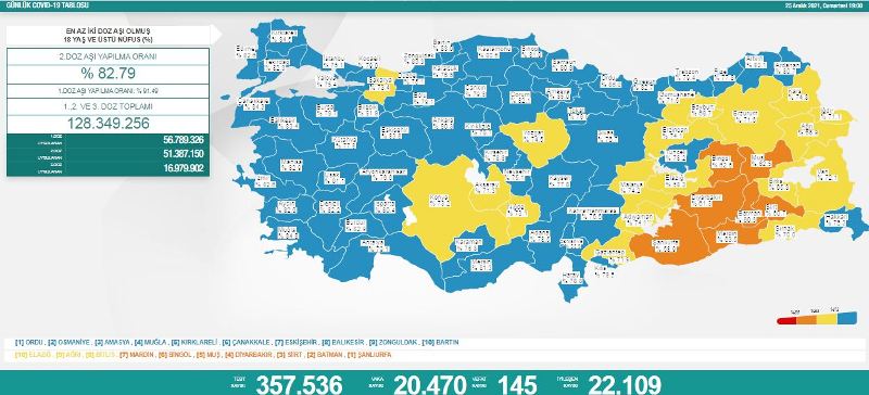 Son 24 saatte, 20 bin 470 yeni vaka tespit edildi. 22 bin 109 kişi de sağlığına kavuşurken corona nedeniyle bugün 145 kişi hayatını kaybetti.