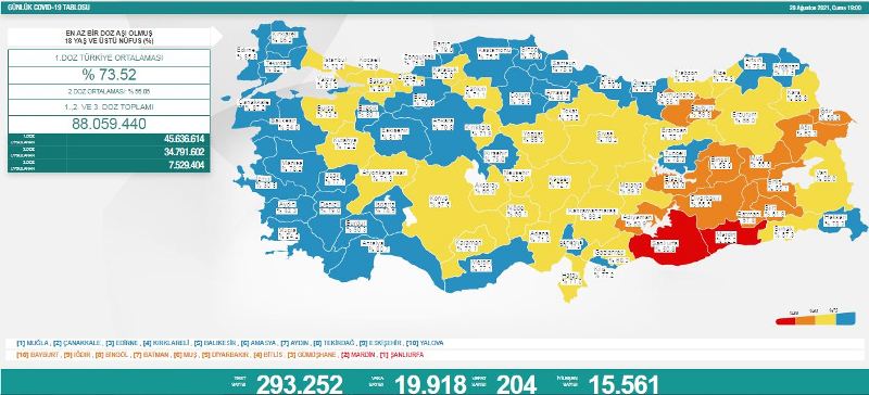 Sağlık Bakanlığı’nın açıkladığı 20 Ağustos 2021 Cuma gününün corona virüsü tablosuna göre, Türkiye’de son 24 saatte 293 bin 252 Kovid-19 testi yapıldı, 19 bin 918 kişinin testi pozitif çıktı, 204 kişi yaşamını yitirdi, iyileşenlerin sayısı ise 15 bin 561 oldu.