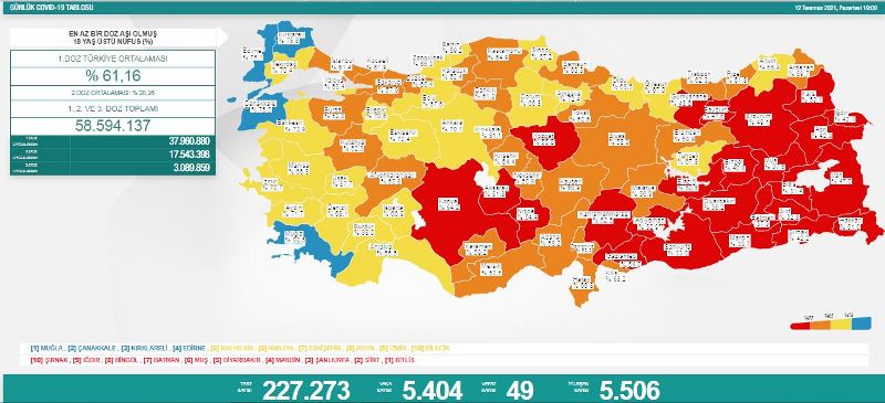 Sağlık Bakanlığı, Türkiye’nin günlük COVID-19 tablosunu açıkladı. 12 Temmuz verilerine göre, 227 bin 223 test yapıldı.