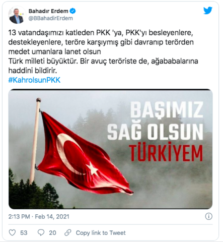 Ağır eleştirilerden sonra Bahadır Erdem, 13 şehidi hatırlamak zorunda kaldı. Erdem, ilk tweetinden iki buçuk saat sonra şehitlerimizi hatırlayan şu paylaşımı yaptı: 13 vatandaşımızı katleden PKK’ya, PKK’yı besleyenlere, destekleyenlere, teröre karşıymış gibi davranıp terörden medet umanlara lanet olsun