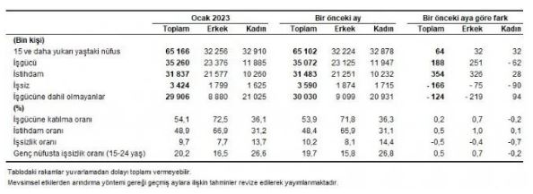 İşgücü 2023 yılı Ocak ayında bir önceki aya göre 188 bin kişi artarak 35 milyon 260 bin kişi, işgücüne katılma oranı ise 0,2 puanlık artış ile %54,1 olarak gerçekleşti. İşgücüne katılma oranı erkeklerde %72,5 iken kadınlarda %36,1 oldu.