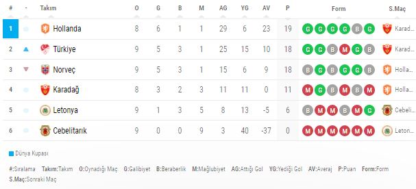 Grubu lider bitiren ekip Dünya Kupası’na doğrudan katılırken, grup ikincisi ise play-off oynama hakkı elde edecek. Rakiplerinin puan kaybını bekleyen Türkiye, gruptaki son maçını 16 Kasım Salı günü deplasmanda Karadağ ile oynayacak. Norveç ise deplasmanda Hollanda ile karşı karşıya gelecek.