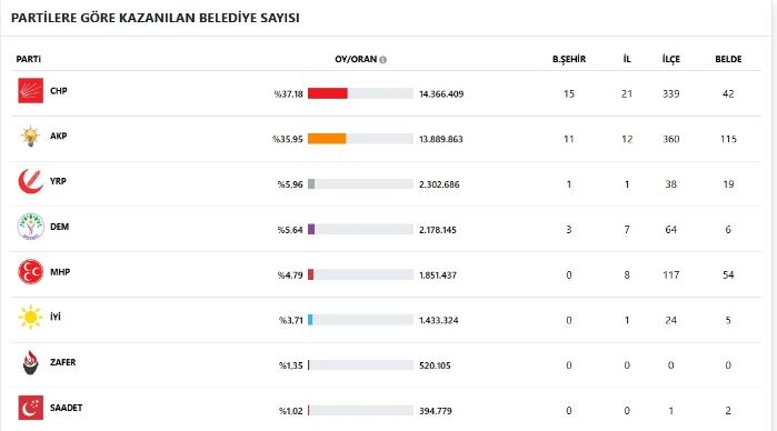 Birçok il kaybeden AKP ise yüzde 37.65 oy ile ikinci sırada yer aldı.