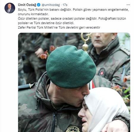 Açıklamalarını, İçişleri Bakanı Süleyman Soylu’yu hedef alarak ve polis fotoğrafları paylaşarak devam ettiren Özdağ, “Soylu, Türk Polisi’nin bakanı değildir. Polisin görev yapmasını engellemekte, onurunu kırmaktadır. Özür diletilen polisler, sadece oradaki polisler değildir. Fotoğraftaki bütün polisler ve Türk devletine özür diletildi. Zafer Partisi Türk Milleti’ne Türk devletini geri verecektir” dedi.