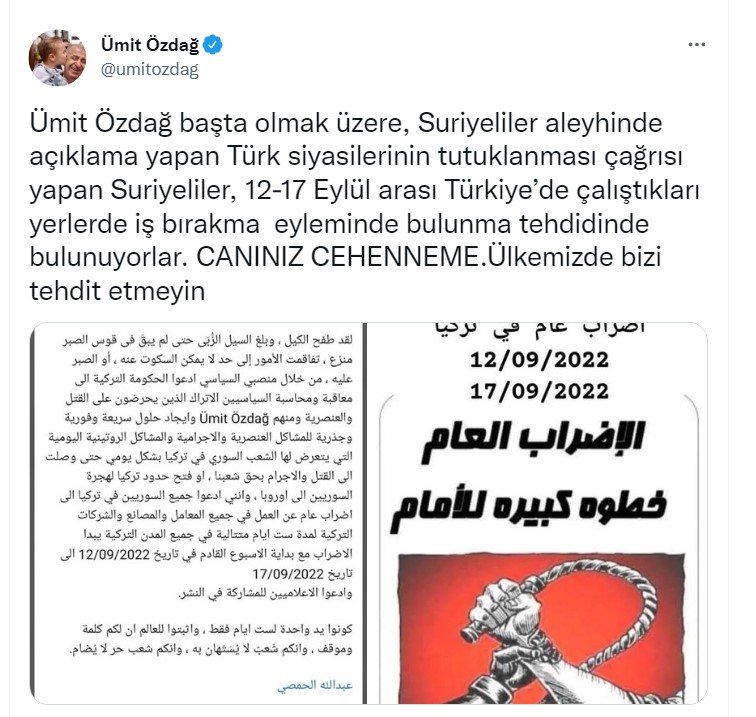 ”Ümit Özdağ başta olmak üzere, Suriyeliler aleyhinde açıklama yapan Türk siyasilerinin tutuklanması çağrısı yapan Suriyeliler, 12-17 Eylül arası Türkiye’de çalıştıkları yerlerde iş bırakma eyleminde bulunma tehdidinde bulunuyorlar. Canınız cehenneme. Ülkemizde bizi tehdit etmeyin.”