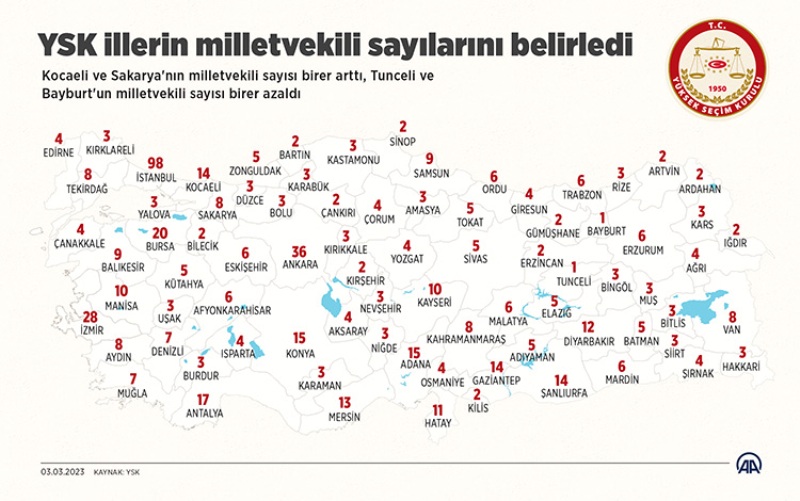 Yüksek Seçim Kurulunun (YSK), nüfus verileri kapsamında illerin milletvekili sayıları dağılım tablosuna göre, Kocaeli ve Sakarya’nın milletvekili sayısı birer arttı, Tunceli ve Bayburt’un milletvekili sayısı birer azaldı.